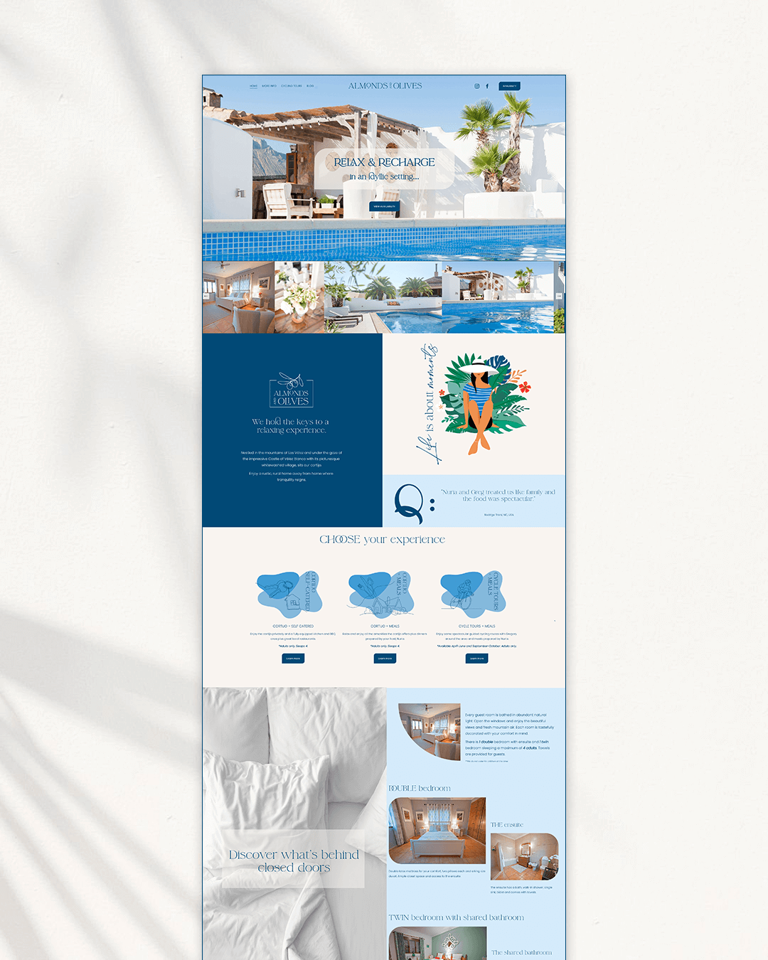 Almonds and Olives was a holiday rental property offering boutique accommodation on an almond and olive farm, complete with a pool and scenic views in the south of Spain. The existing website was outdated and no longer aligned with the new owners' vision of providing a more enhanced accommodation experience. They sought a complete rebrand and website overhaul to better capture the essence of relaxation and rejuvenation. The refreshed brand aimed to position the property as a unique, niche getaway that invites guests to unwind and recharge in an authentic countryside setting.
